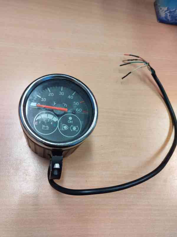 Rychloměr do 60 km/h, integrované motohodiny (OH) a kontrolky (dobíjení, dálková světla, blinkry).