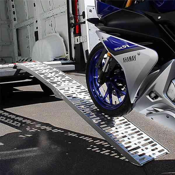Nájezdová univerzální rampa o celkové nosnosti 680 kg (2ks cena 4100 Kč / 1ks cena 2200 Kč). Nové velmi praktické skládací hliníkové rampy pro motocykly, skútry, čtyřkolky, zahradní traktůrky, lehčí stavební stroje, invalidní vozíky, atd. Jsou vysoce odolné, snadná manipulace, jedna ližina váží pouze cca 8 kg. Rozměry: délka 225 cm, ve složeném stavu: délka 116 cm, výška 14 cm. Max. nosnost jedné 340 kg, pár - 680 kg. Možný prodej jak jednotlivě tak po dvou kusech.