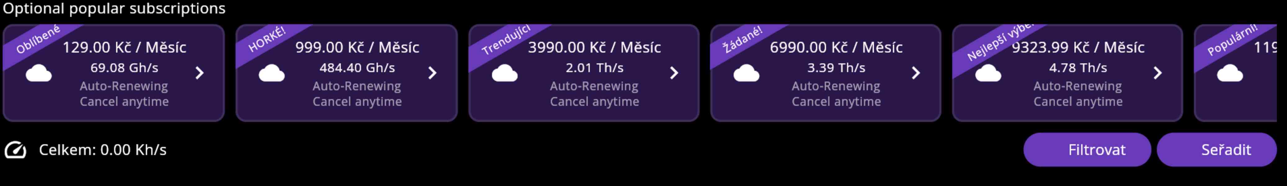 Můžete těžit zdarma a obnovovat těžební stroj každých 7 a 24 hodin a nebo koupíte svůj těžební plán a budete těžit více bitcoinu. Těžební plán můžete koupit na měsíc, tři měsíce a nebo na rok.