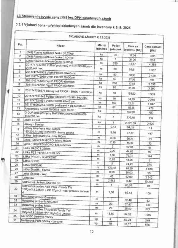 Insolvenční správkyně dlužníka PRO GYM Profesional s.r.o., se sídlem Chýnovská 378, 391 11 Planá nad Lužnicí, IČ: 031 37 911 nabízí k přímému prodeji movitý majetek, a to skladové zásoby dlužníka, které sloužily k jeho textilní výrobě, kdy tyto jsou specifikovaný blíže v příloze č. 1 této inzerce. Skladové zásoby jsou sepsány v soupisu majetkové podstaty dlužníka ze dne 13.10.2025 pod položkou II. poř. č. 58. Jedná se zejména o rouno, výplně, látky, proševy, polyester rouno a další textilní výrobky.