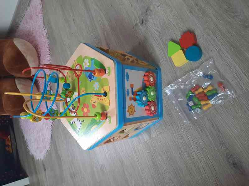 Interaktivní edukační hračka ve tvaru hexagonu, vhodná pro rozvoj motoriky a logického myšlení. Dobře navržené pro různé aktivity. Horní hrací plochu lze využít na hru s figurkami (součástí hračky), z druhé strany logická protahovačka. Na bocích různé hry, např. hodiny, otvory na kostky, malé puzzle, posunovací hra, malé počítadlo. Celodřevěná s plastovými prvky. Vhodné pro děti od 1 roku, hra s figurkami pak od 3 let.