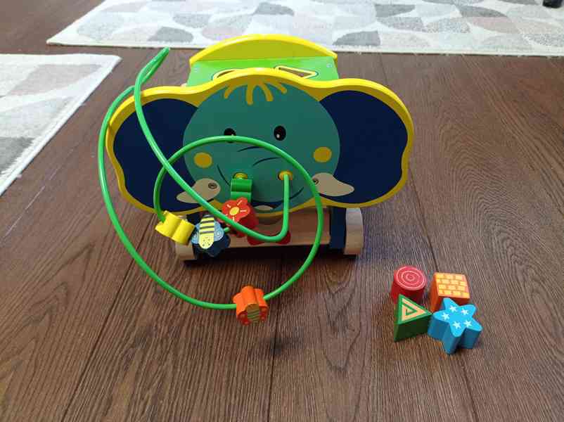 Prodám motorickou hračku slon z bukového dřeva, Na stranách hračky jsou labyrint na cvičení motoriky, prkno s geometrickými tvary na zasouvání, dvoustranná skládačka z šesti kostek a barevná ozubená kolečka. Dětské barevné motivy zdobí kolečka a hrací prvky. Ve výborném stavu.