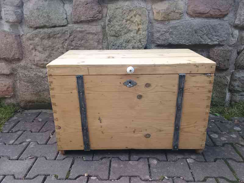 stará smrková truhla po komplet renovaci, okovaná, louhovaná, zbaveno škůdců, broušená, bez povrchové úpravy, po dohodě možno olejem nebo voskem, zamykatelná ,cena + cca 10%, rozměry. v-51 cm, š - 80 cm, hl - 45 cm, vhodná na chalupu, penzion, tel info 603210073