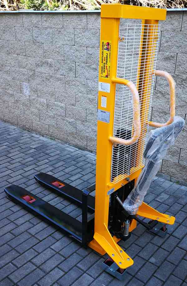Vysokozdvižný vozík nový nosnost 1000kg, zdvih 1200mm. Kvalitní kola polyuretan. Nízká konstrukční výška vozíku. Manuální zdvih i pojezd. Záruka 24 měsíců.