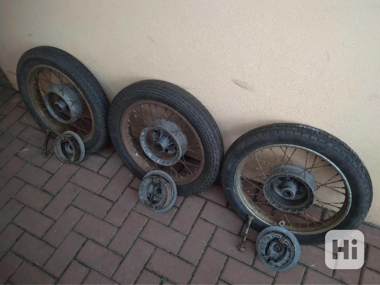 Prodám na motocykl JAWA (kývačka,panelka aj.) v původním stavu 3 ks kompletních 16“ kol :originál ráfky,ložiska,prachovky a kompletní brzdový segment (tento ve velmi dobrém stavu) ,včetně velice dobrého brzdového obložení obložení.Součástí i 2x originál upínací šroub kola s podložkami a matkou.Kola samozřejmě včetně pneumatik a to:1x Barum 3,25x16 dále 1x Barum 3,5x16 a 1x Decum (Madein poland) 3,00x16.Ráfka koroze (ponecháno v původním stavu bez zásahu)