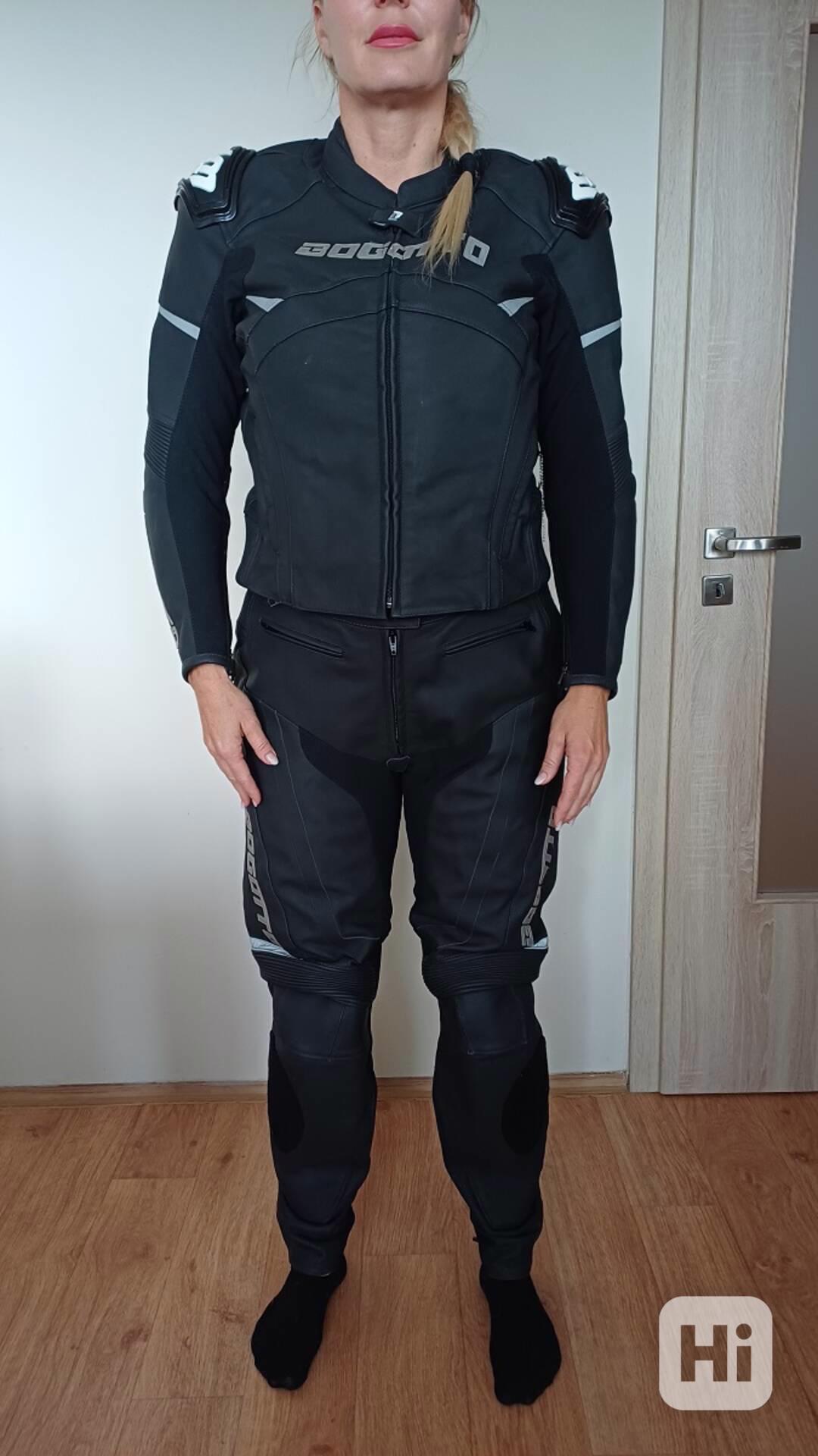 Kožená dámská 2 – dílná kombinéza od značky Bogotto model Misano ve velikosti – 46 vhodná na větší a plnější postavu. Je nová a nepoužitá, včetně visaček, celkově samozřejmě výborný stav. Zaujme klasickým, sportovním designem a funkčními detaily.