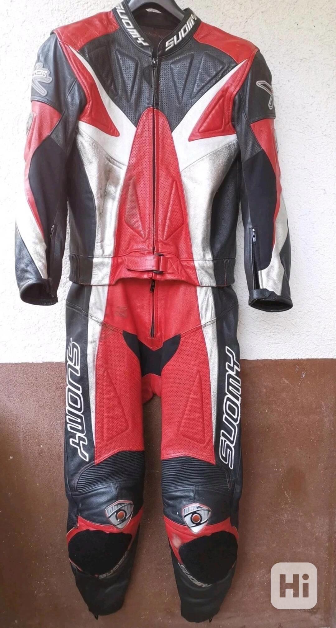 Kožená 2 – dílná kombinéza od značky Suomy ve velikosti – 50. Je používaná, včetně oděrek s používání, celkově dobrý stav.