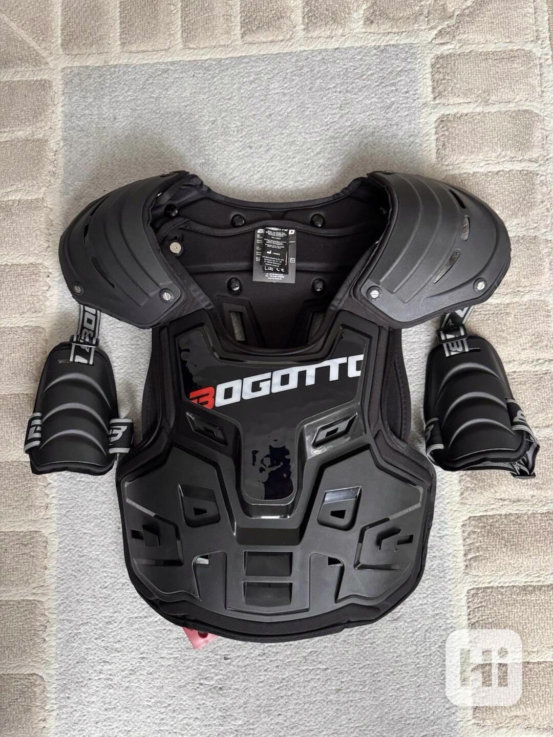Snadné nasazení a sundání, lze nosit pod nebo přes dres, větraná tepelně stlačená pěna, nastavitelné rychloupínací přezky, nastavitelné ramenní popruhy se suchým zipem, nápis Bogotto na přední straně a na nastavovacím popruhu, logo Bogotto na zadní straně.