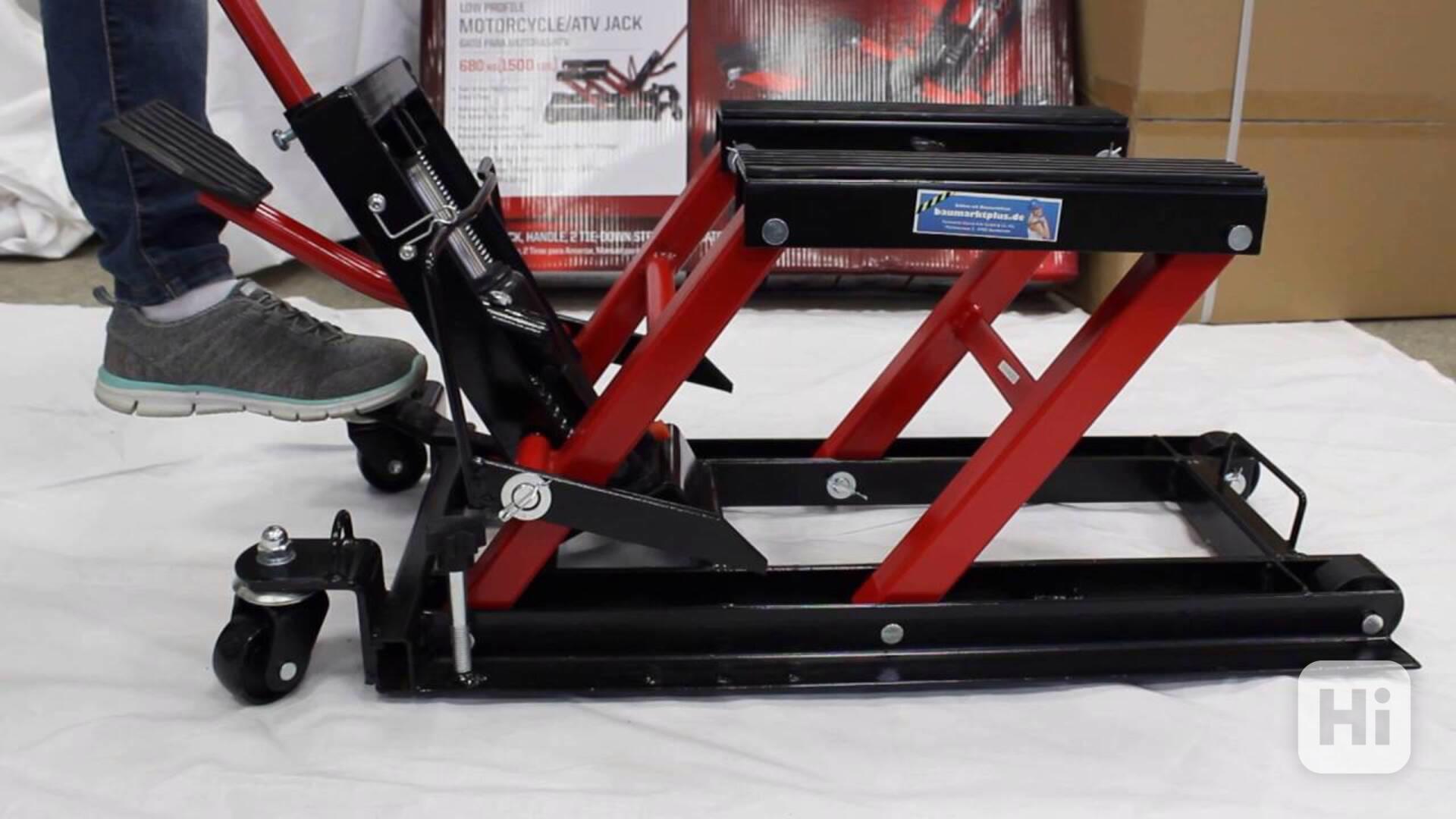 Hydraulický zvedák na motorky a čtyřkolky. Vhodný do motoservisů, ale i pro jednotlivce do dílen. Velmi praktický pomocník při opravách a servisů motorek. Vysoce robustní ocelová konstrukce, plynule nastavitelná výška zdvihu, hydraulické zvedání a vypouštění, možné zajištění motorky pomocí popruhů, bezpečnostní pojistka, maximální nosnost 680 kg, hmotnost zvedáku 30 kg. Rampa je zcela nová, nepoužitá a ještě originálně zabalená.