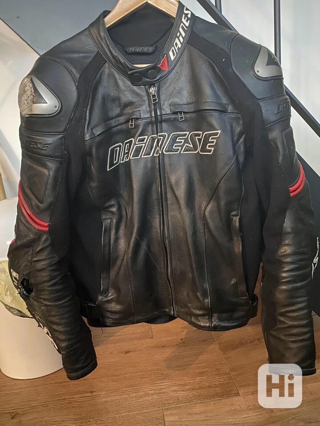 Kožená bunda na motorku od značky Dainese ve velikosti 50 (M). Je použitá a po pádu na pravou stranu, je roztržené předloktí, viz. foto, vhodné na opravu. Osobní odběr Rokycany nebo mohu poslat.