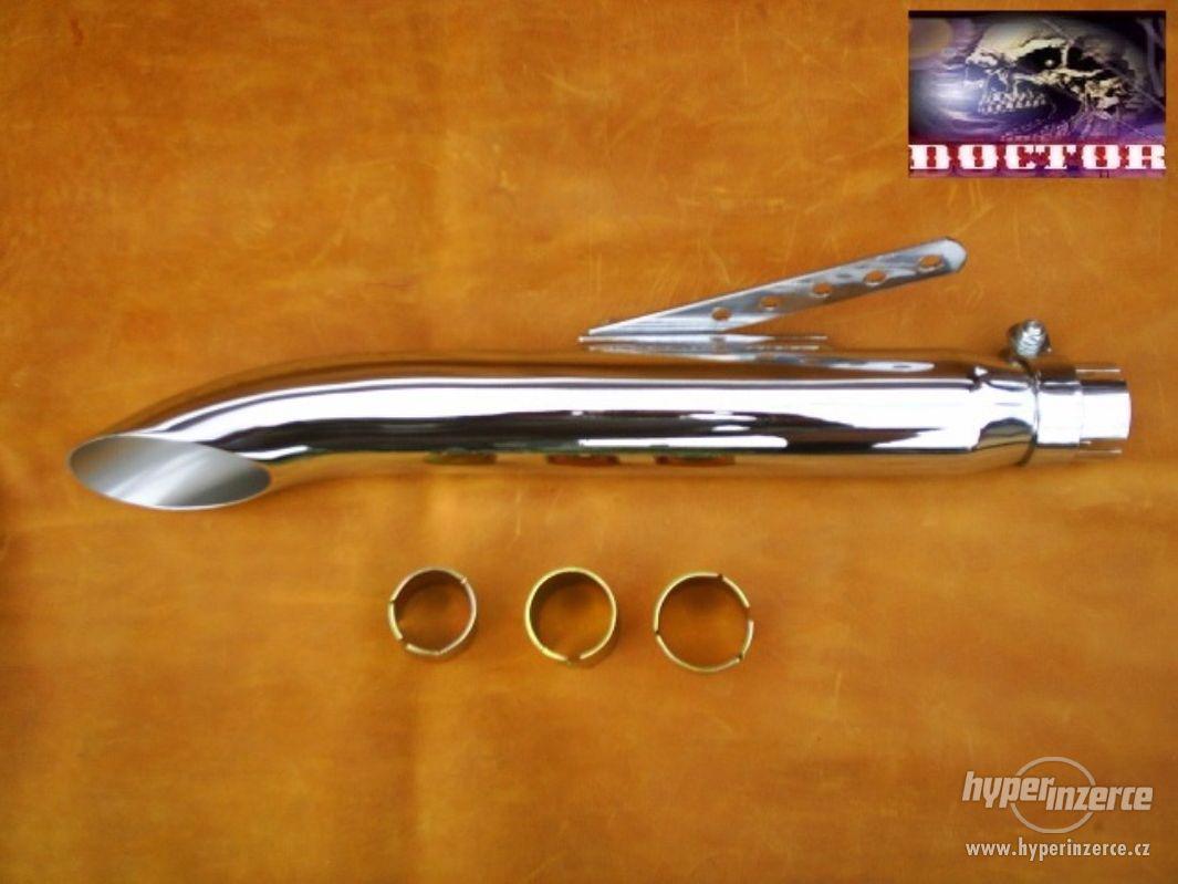 Nové universální laděné koncovky výfuku,snadná montáž na většinu moto díky universálnímu úchytu.Montáž možná na levou i pravou stranu.Průměr otvoru na svod 46 milimetrů.Všechny ostatní rozměry na foto č.5 a 6.Součástí koncovky je montážní set redukcí na průměr svodu 36,38,40 milimetrů.Výfuky mají pěkný hluboký basový zvuk,nejsou to jen prázdné trubky,uvnitř je pevná tlumící vložka.Koncovky jsou dost těžké a masívní.Cena 1500 Kč kus.Pro více info o vhodnosti na daný typ moto mne prosím kontaktujte.