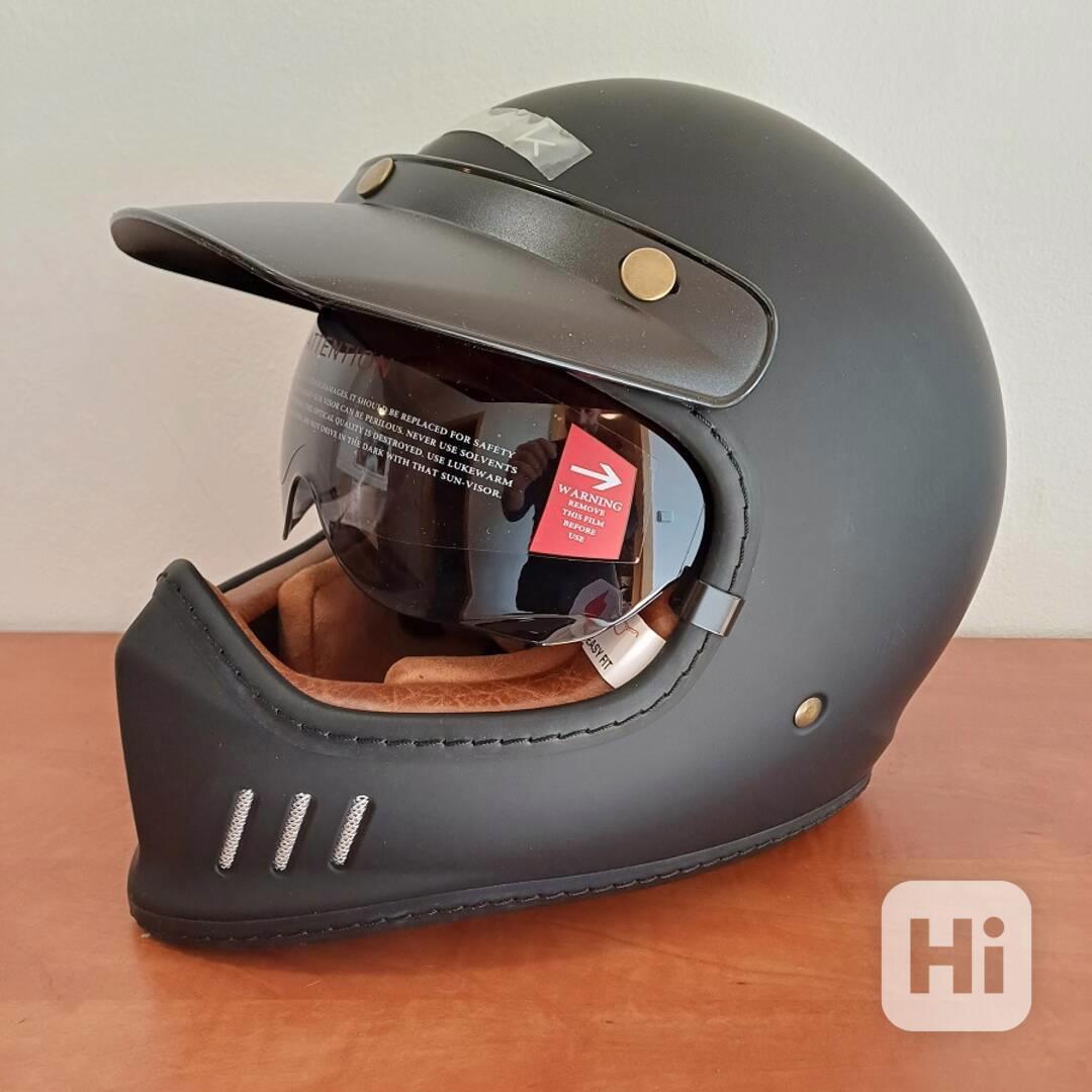 Klasický styl nové retro přilby. Materiál lehká skořepina z pevného polykarbonátu pro pohodlí i ochranu, elegantní hnědý kožený interiér, jedinečný retro design, odnímatelný kšilt, atd.