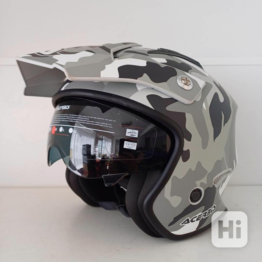 Prodám nové dvě přilby pro trial nebo skútr od značky Acerbis All Use ve velikostech: XS (53/54) a M (57/58). Lehká konstrukce ze sklolaminátu. Vyjímatelné. pratelné, pot absorbující polstrování. Výškově nastavitelný kšilt. Fidlock magnetické zapínání, snadné zapínání a rozepínání jednou rukou. Splňuje normy DOT a ECE 22.05.